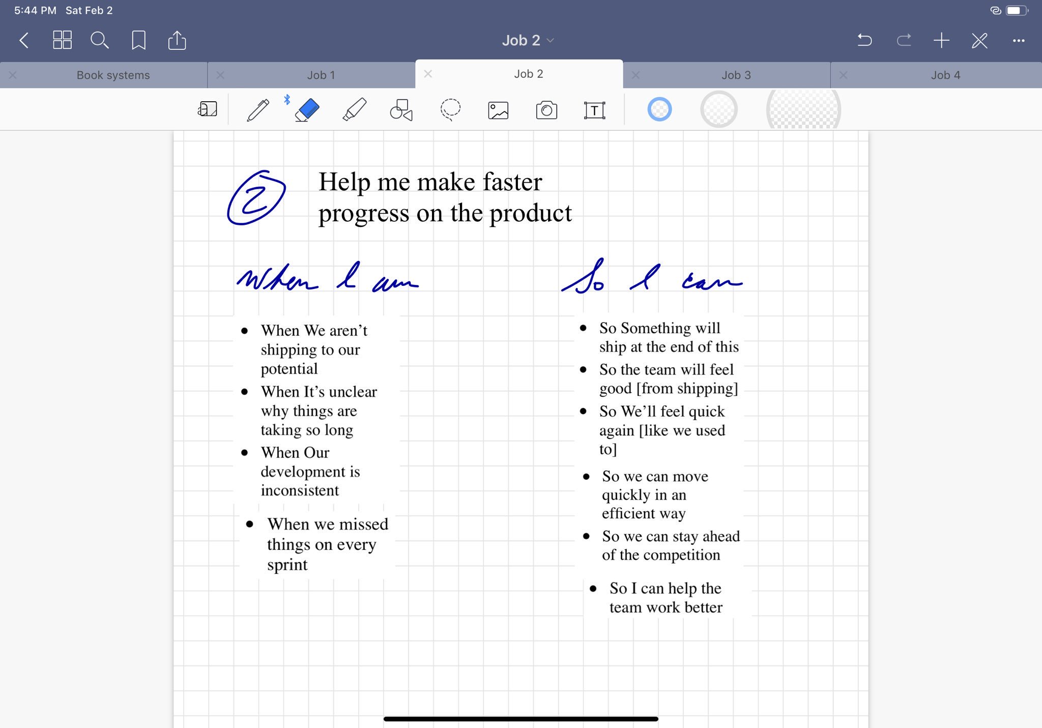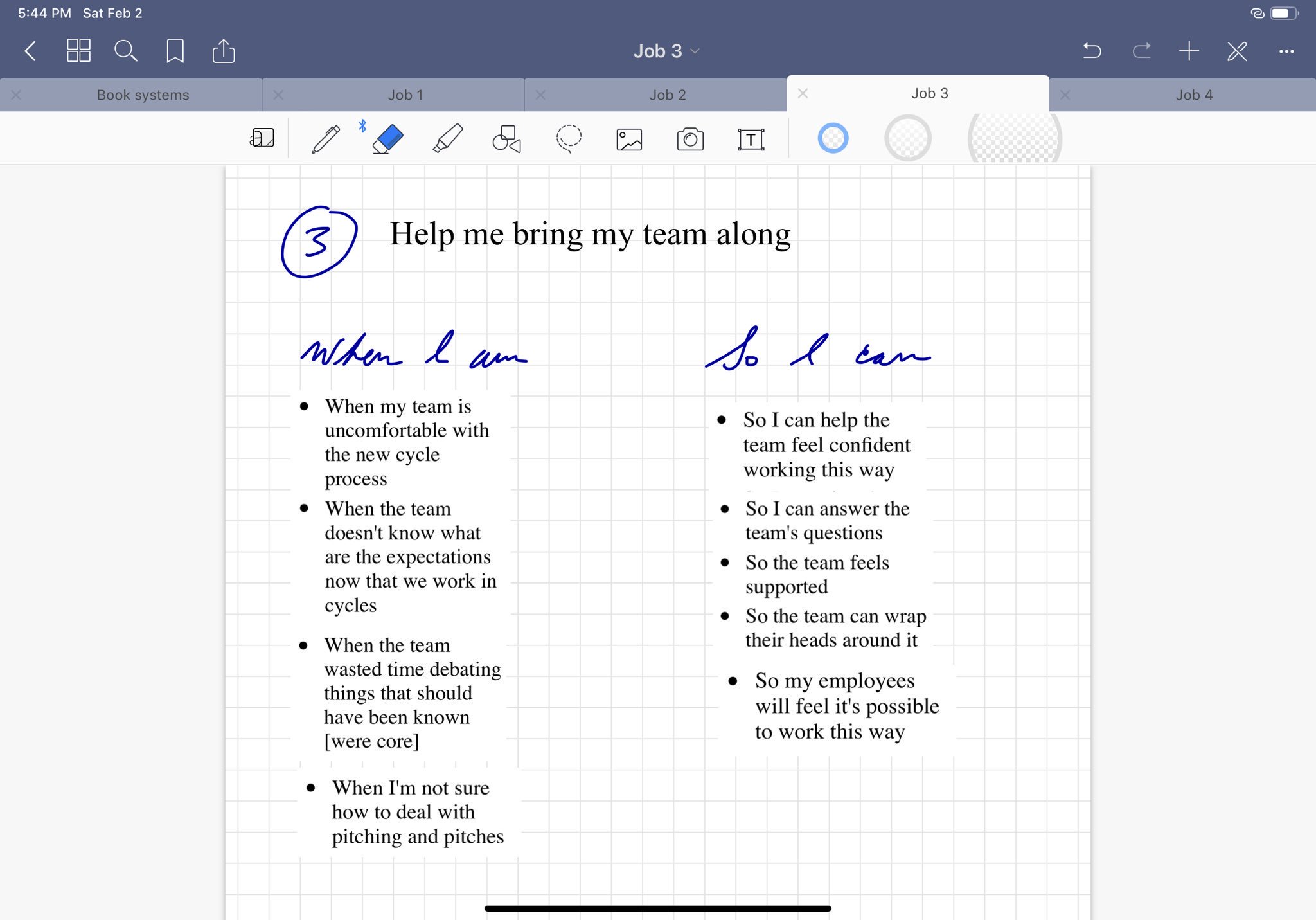 I did a quick jobs-to-be-done analysis on the interviews and pulled out four jobs they were hiring the workshop to do. Since I considered the workshop a proxy for the book, I could use these jobs to define the key requirements.