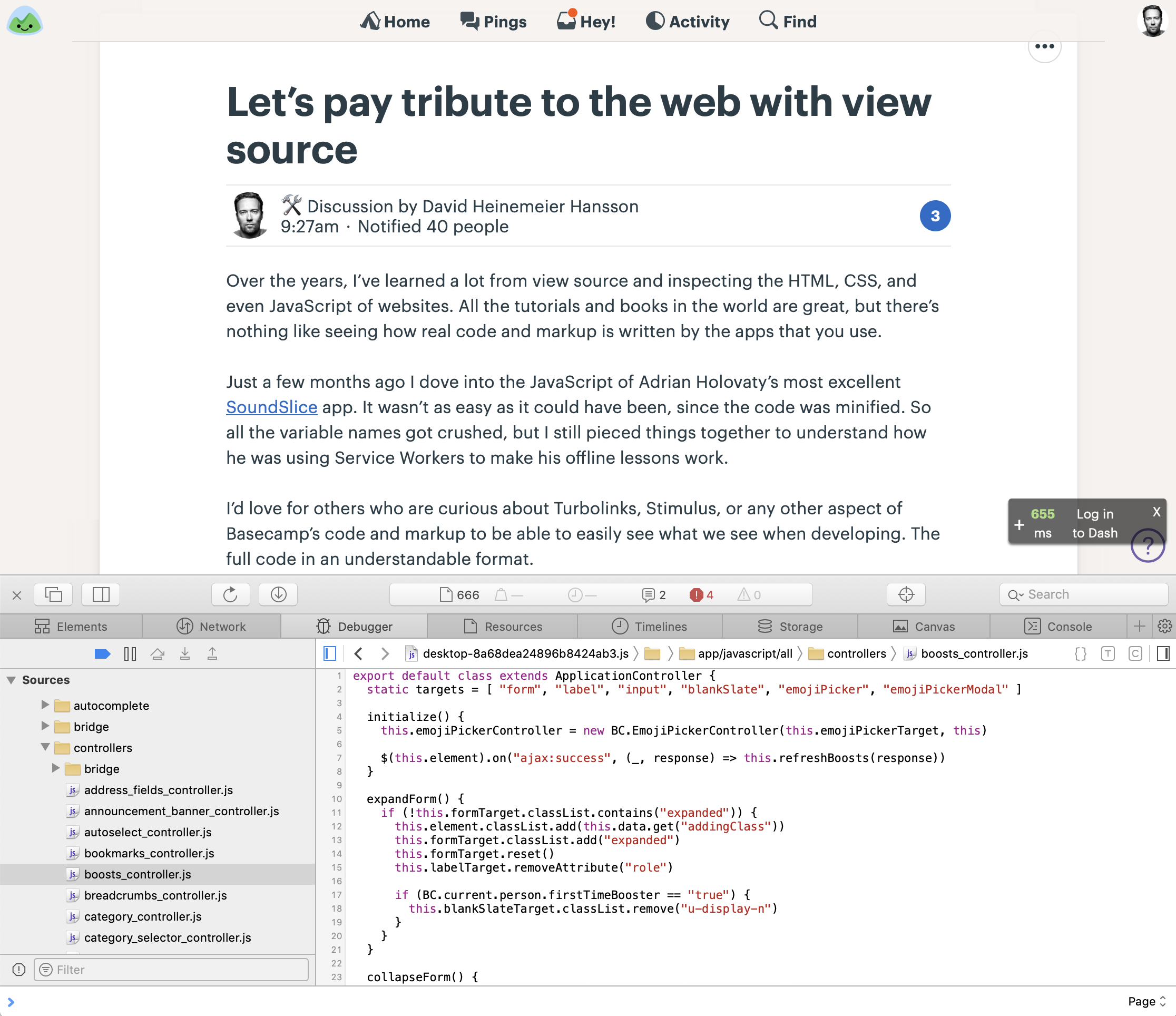 All the JavaScript that runs Basecamp 3 under Webpack now has source maps available! We’re still looking into what it’ll take to get source maps for the parts that were written for the asset pipeline using Sprockets, but all our Stimulus controllers are compiled and bundled using Webpack, and now they’re easy to read and learn from.