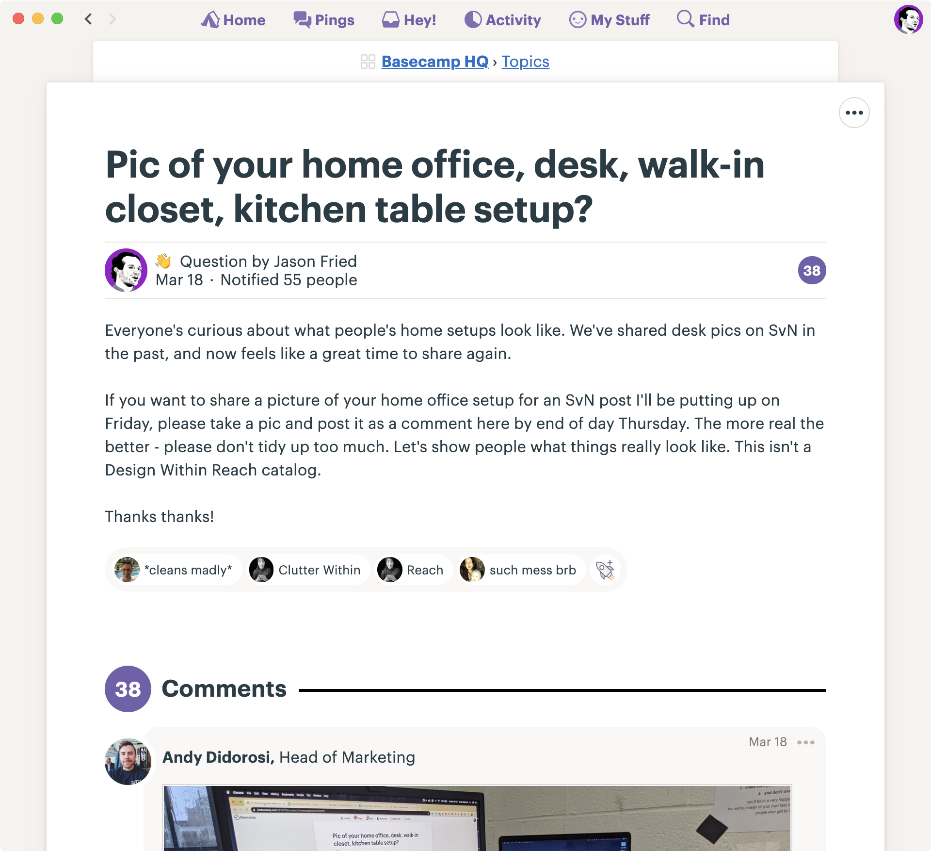 People are always curious about work-from-home (WFH), remote working setups. So, I posted a Basecamp message asking our employees to share a photo of their home office, desk, table, whatever. Here’s what came in.